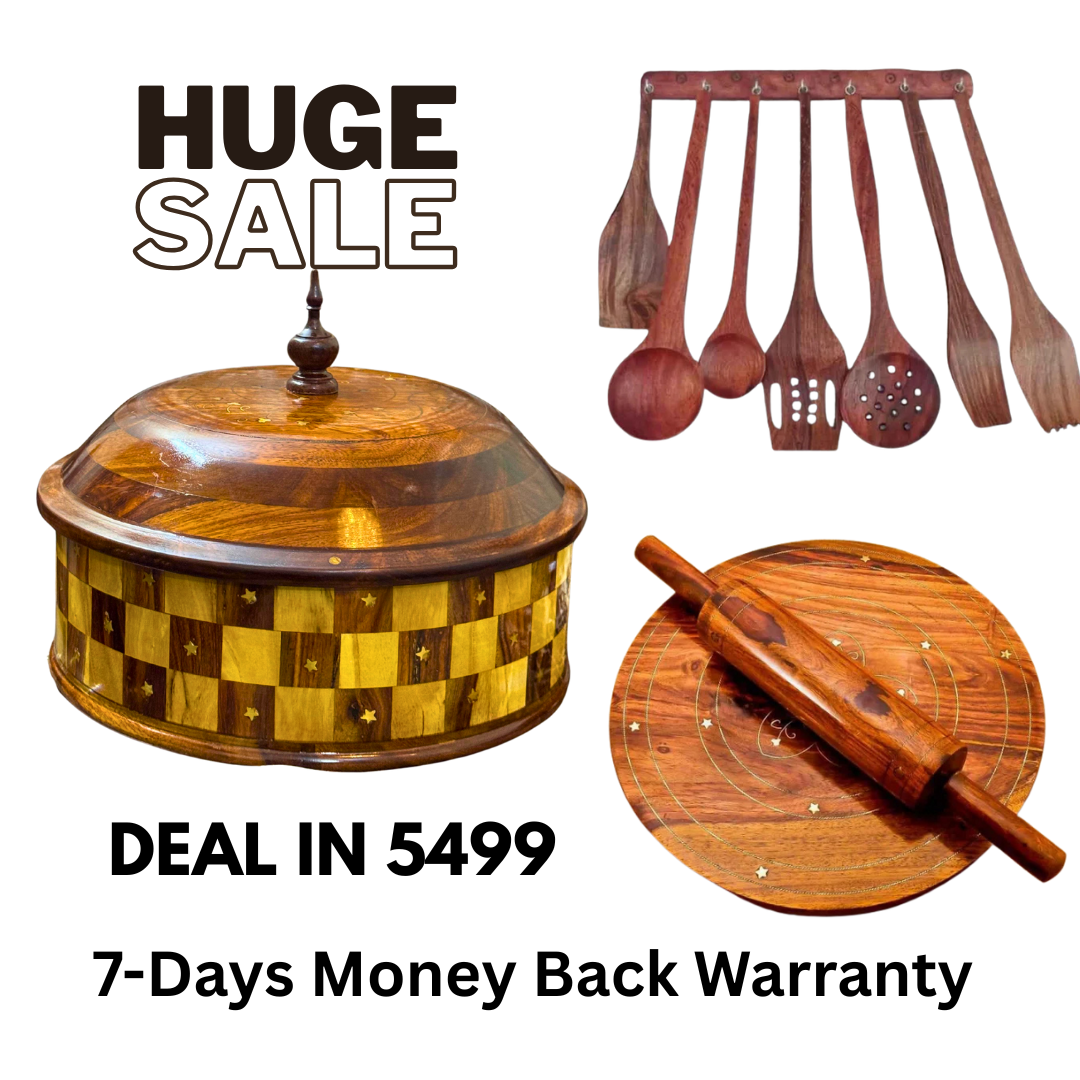 Upgrade your kitchen with timeless elegance and eco-friendly durability! This exclusive deal brings together our Traditional Wooden Hotpot, Premium Cooking Spoons, and Chakla Belan – all handcrafted from high-quality Sheesham wood.